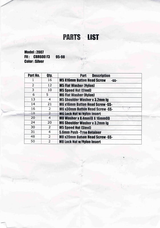 KOMPLET ŚRUB DO OWIEWEK HONDA CBR 600 F3 1995-1998
